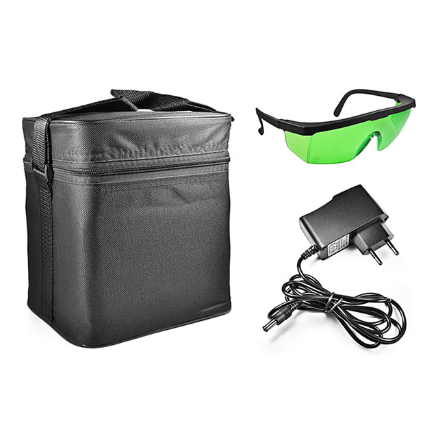 Комплектація: лазерний рівень, сумка, батарейки, блок живлення від мережі з USB проводом, окуляри, інструкція з експлуатації, гарантійний талон.